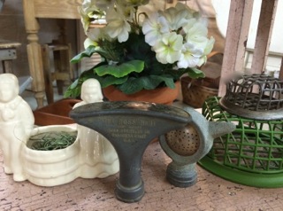 Garden time is neatly presented in this vignette from Dealer #46. Flower frogs take center stage with other garden accessories.