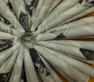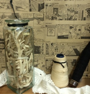 Dealer #62 has this vignette of spools and jars tucked into a niche which is decorated with more paper.