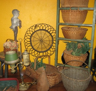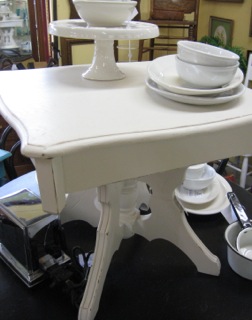 Dealer #2 has a delightful table with apron and leg interest. Tone on tone plates and bowls sit on top.