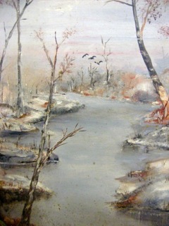 Dealer #150 has this neutral oil painting of a winter scene. One can imagine hiking in and discovering this serene place.