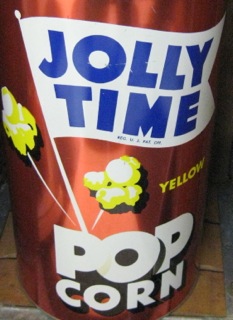A vintage trash can has bold advertising from Jolly Time Popcorn. Available from Dealer #37. Can you hear it popping?