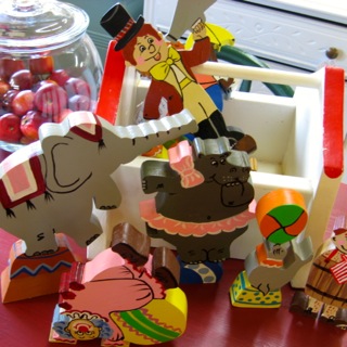 Dealer #2 has a wooden carry box filled with hand-painted circus figures.
