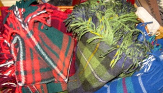 Colorful wool fringed throws are stored in a great basket. Perfect throughout the home and by the fire! Available from Dealer #79.