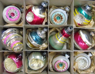 Dealer #8 has boxes of Shiny Brites ready for the tree in favorite colors and concave designs!