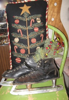 A wonderful vignette of green child's chair topped with felt pillow and skates; perfect for the entry to welcome guests!! Also from Dealer #46.