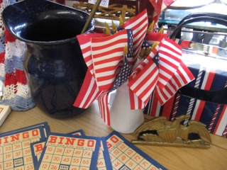 Dealer #25 has an amazing collection of red, white, and blue items from vintage Bingo cards and satchels, to enamelware and crocheted doilies and miniature flags.