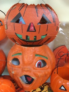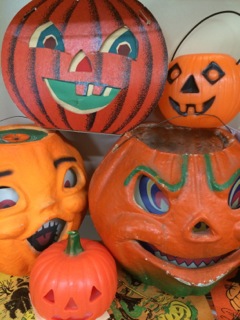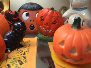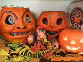 Vintage hand puppet and candy bags amidst Jack-o-lanterns from Dealer #91.