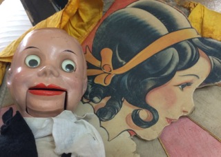 Dealer #15 shows off a vintage ventriloquist's dummy alongside a cutie pie! Inspiration for costumes...
