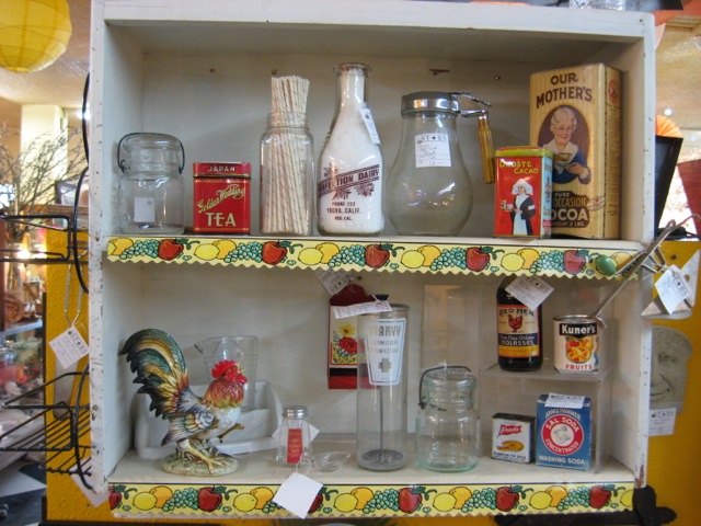 Dealer #12 has a simple shelf with colorful bands filled with vintage spice tins and kitchen basics. Have your basics in easy reach and keep this on the countertop or hang just inside the pantry.