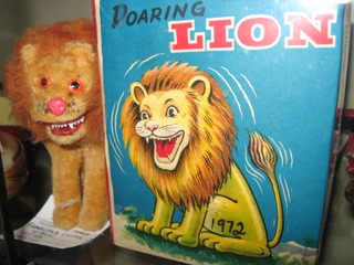 March has certainly come in like a lion with the recent ice, heavy rains and winds. Good heavens we are only Day 6. We can only hope it goes out like a lamb! Dealer #98 has a vintage roaring lion toy complete with original colorful box.