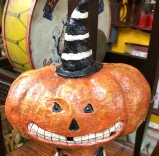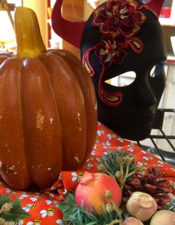 Dealer #69 shows off traditional masks, pumpkins, and natural garlands for festive fall color.