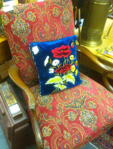 Those two word always describe Dealer 11's booth space at Splendid. We love this upholstered chair. They have is priced at $650. The fabulously colored pillow is $65.00